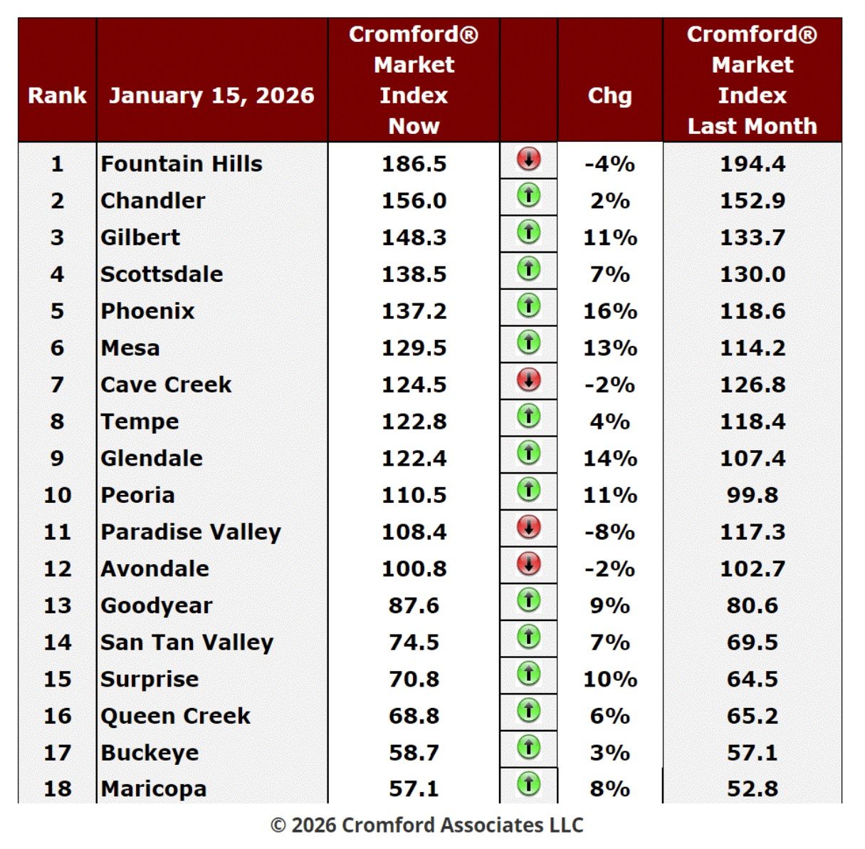 Jan - Here is our latest table of Cromford® Market Index values for the single-family markets in the 18 largest cities.